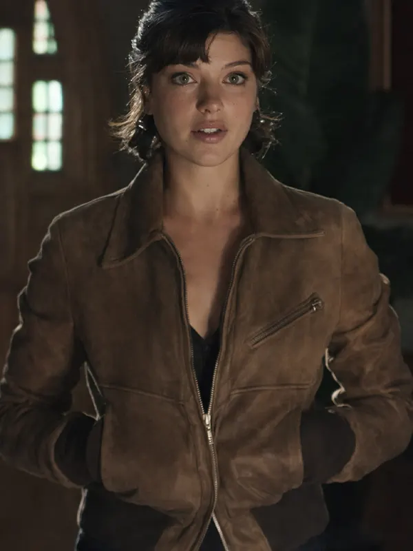 Worn by Bree in the Tell Me Lies series, this brown jacket is made using suede leather, soft viscose lining, full length sleeves, ribbed cuffs, shirt style collar, and zipper closure, completed by three outside pockets and two inside pockets. It suits casual fashion, relaxed outdoor activities, and urban everyday wear.