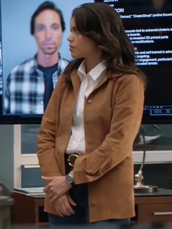 Angela Lopez Brown Suede Jacket from The Rookie series is crafted using suede leather with soft viscose lining, full length sleeves, buttoned cuffs, shirt style collar, and button closure, featuring two outside pockets and two inside pockets. It is perfect for casual outings, office wear, daily routines, and stylish everyday professional looks.