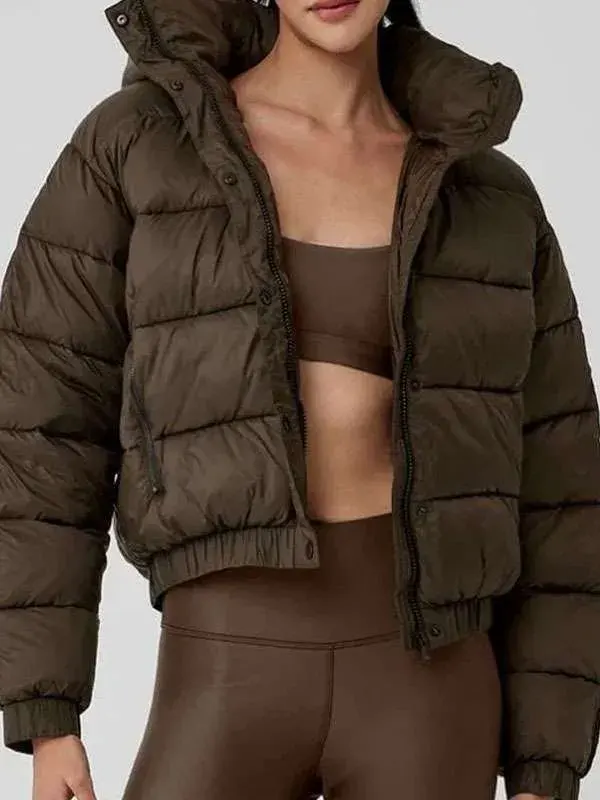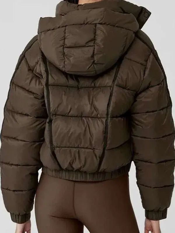 Styled by Demi Engemann in The Secret Lives Of Mormon Wives series, this puffer jacket is built using parachute fabric, soft viscose lining, full length sleeves, elastic cuffs, hooded style collar, and zipper and snap button closure, featuring two outside pockets and one inside pocket. It suits winter outings.