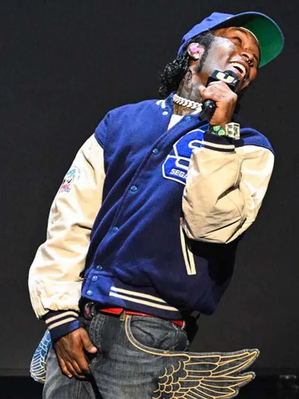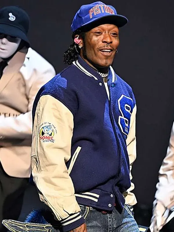Lil Uzi Vert Blue Varsity Jacket from The Tonight Show series is built using wool and leather, soft viscose lining, full length sleeves, ribbed cuffs, rib knit collar, and button closure, featuring two outside pockets and two inside pockets. It suits concerts and standout casual fashion.