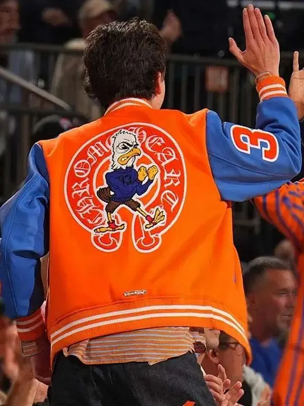 Timothée Chalamet Knicks Game Orange And Blue Varsity Jacket