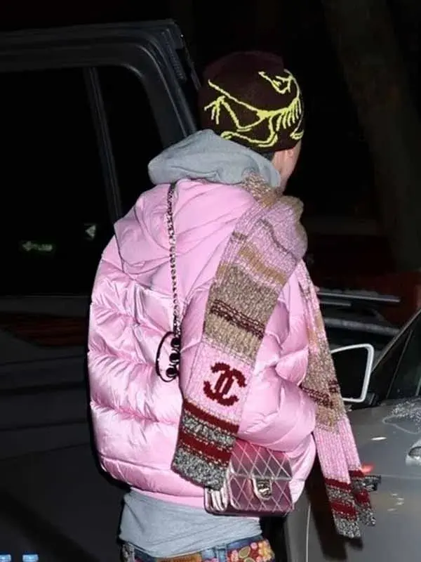 Timothee Chalamet Pink Puffer Jacket is designed using fleece and parachute fabric, soft viscose lining, full length sleeves, ribbed cuffs, hooded collar with strings, and zipper closure, featuring two outside pockets and two inside pockets. It suits winter fashion and bold styling.