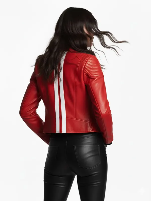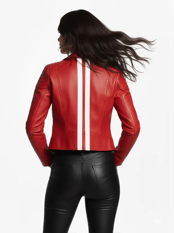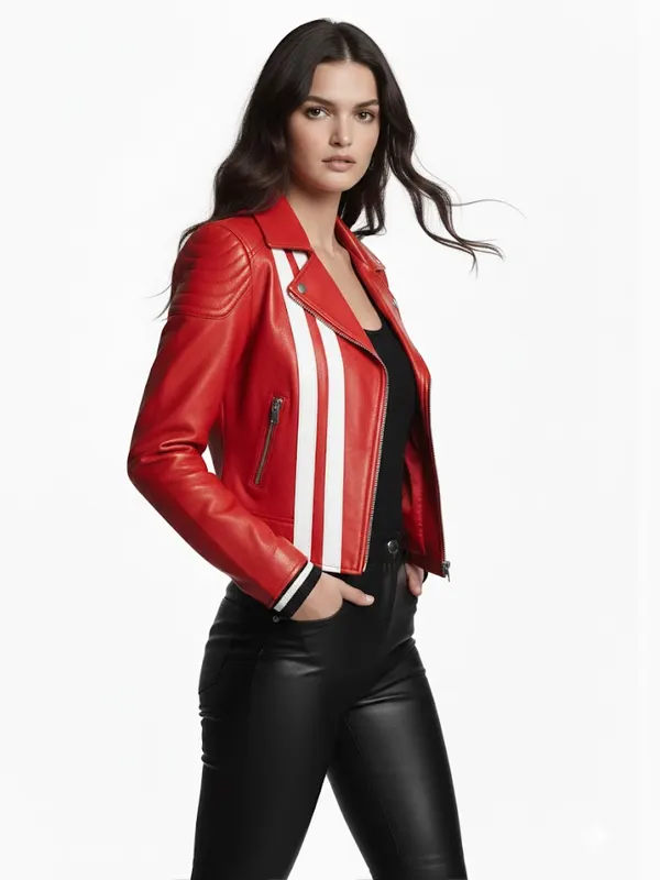 Women’s Vertical White Stripes Red Moto Leather Jacket