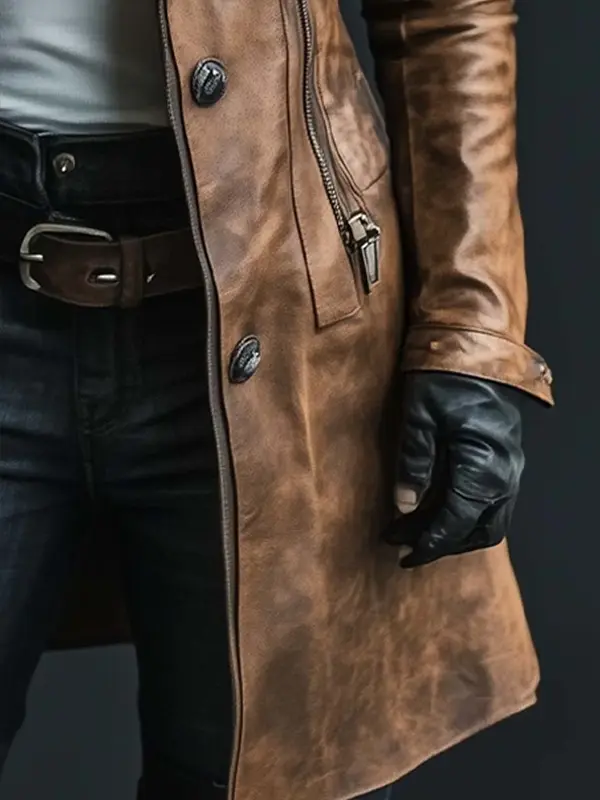 Women’s Vintage Style Brown Faux Leather Long Coat With Fur Collar