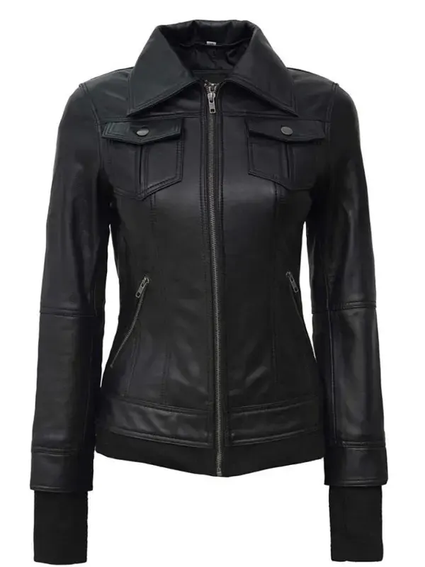 Stylish Women Black Leather Bomber Jacket With Detachable Hood