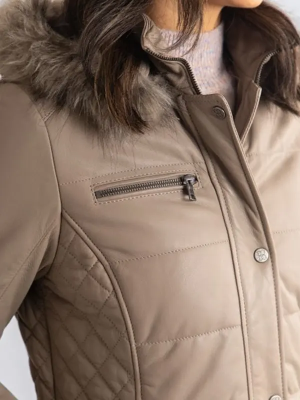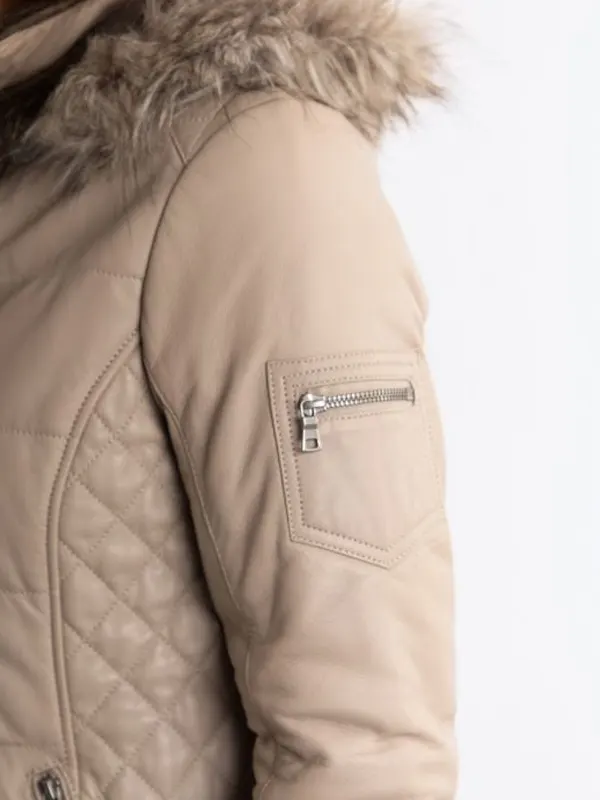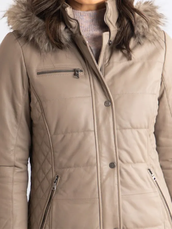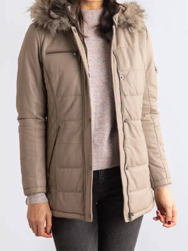 Women’s Fairfield Fur Hooded Beige Padded Leather Coat