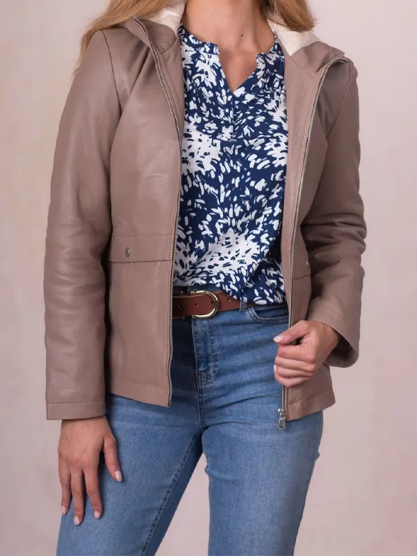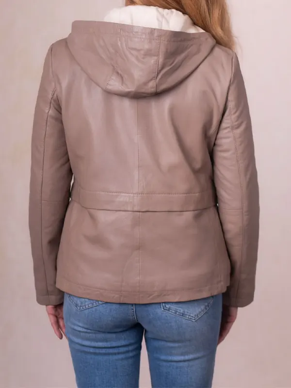Women’s Helton Beige Hooded Style Genuine Leather Jacket