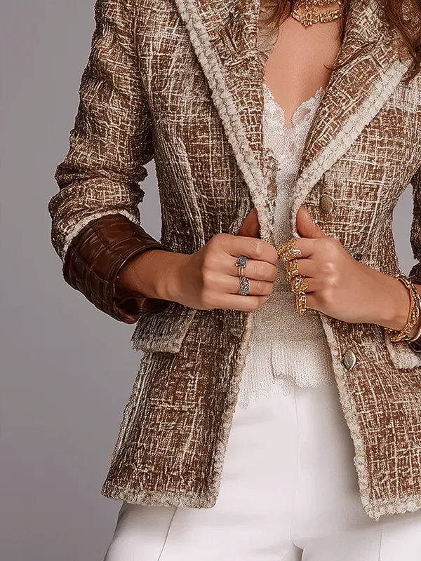 Women’s Stylish Textured Tweed Khaki Leather Blazer