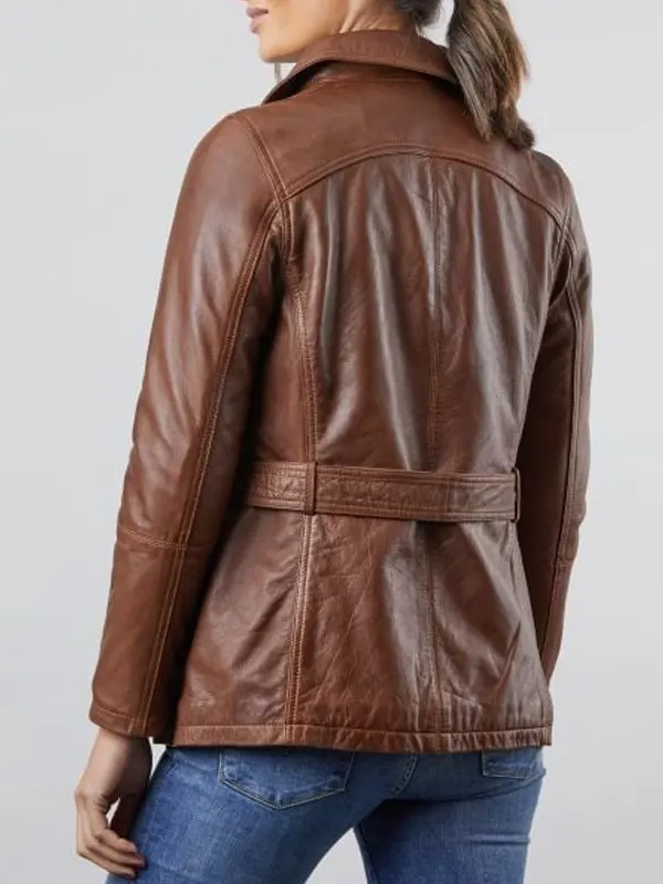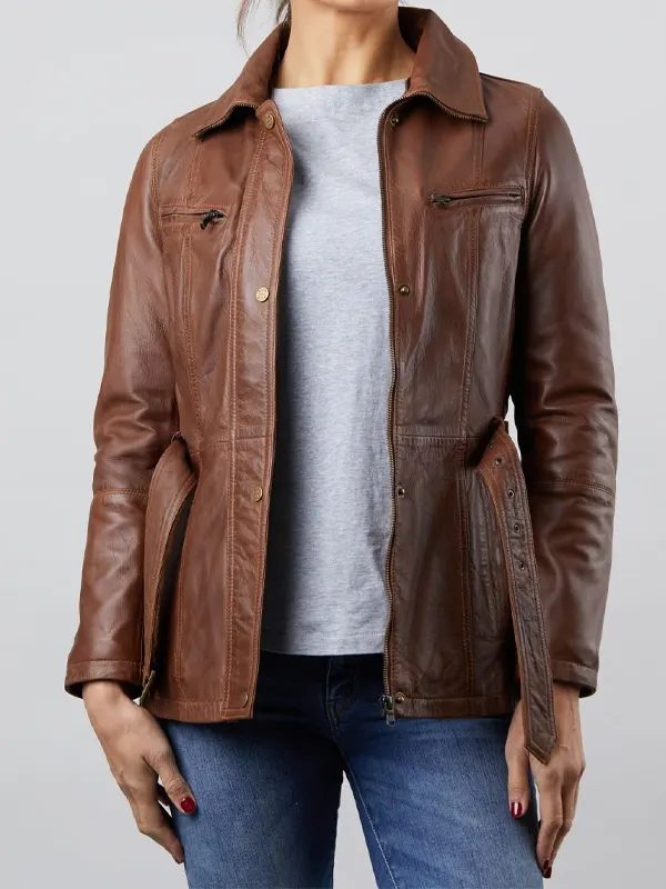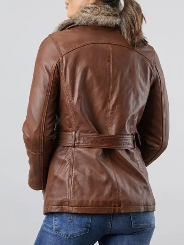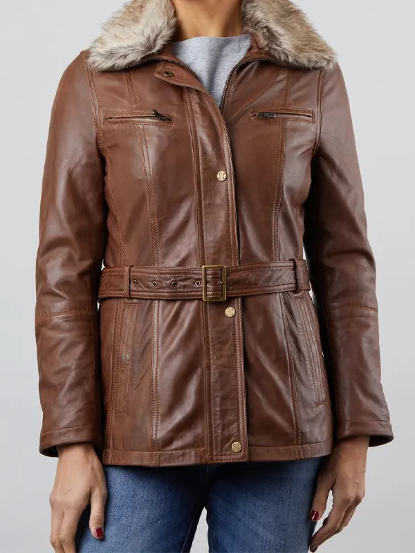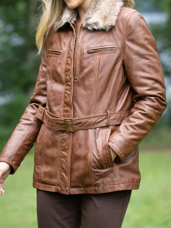 Women’s Tirril Tan Belted Leather Coat With Faux Fur Collar